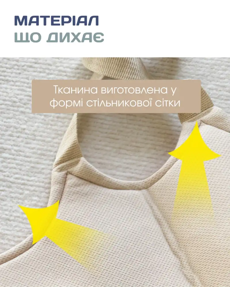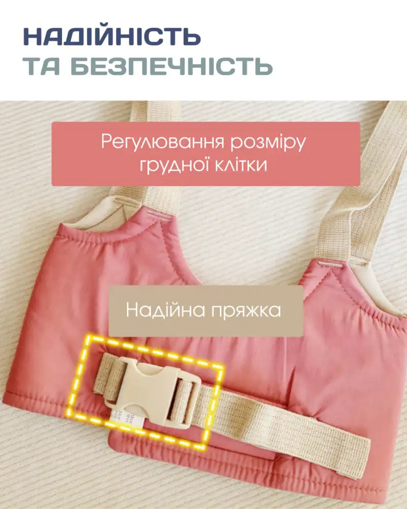 Усі ремені з широким діапазоном регулювання під вік та комплекцію дитини та зросту дорослого. М'які подушечки під пахвами та на знімній лямці в місцях прилягання захищають ніжну шкіру дитини від контакту зі швами.